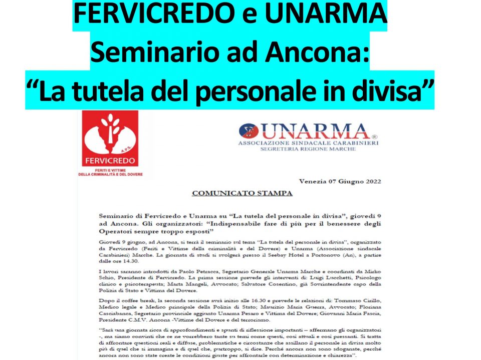 Seminario di Fervicredo e Unarma su “La tutela del personale in divisa”, giovedì 9 ad Ancona. Gli organizzatori: “Indispensabile fare di più per il benessere degli […]